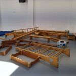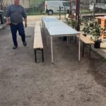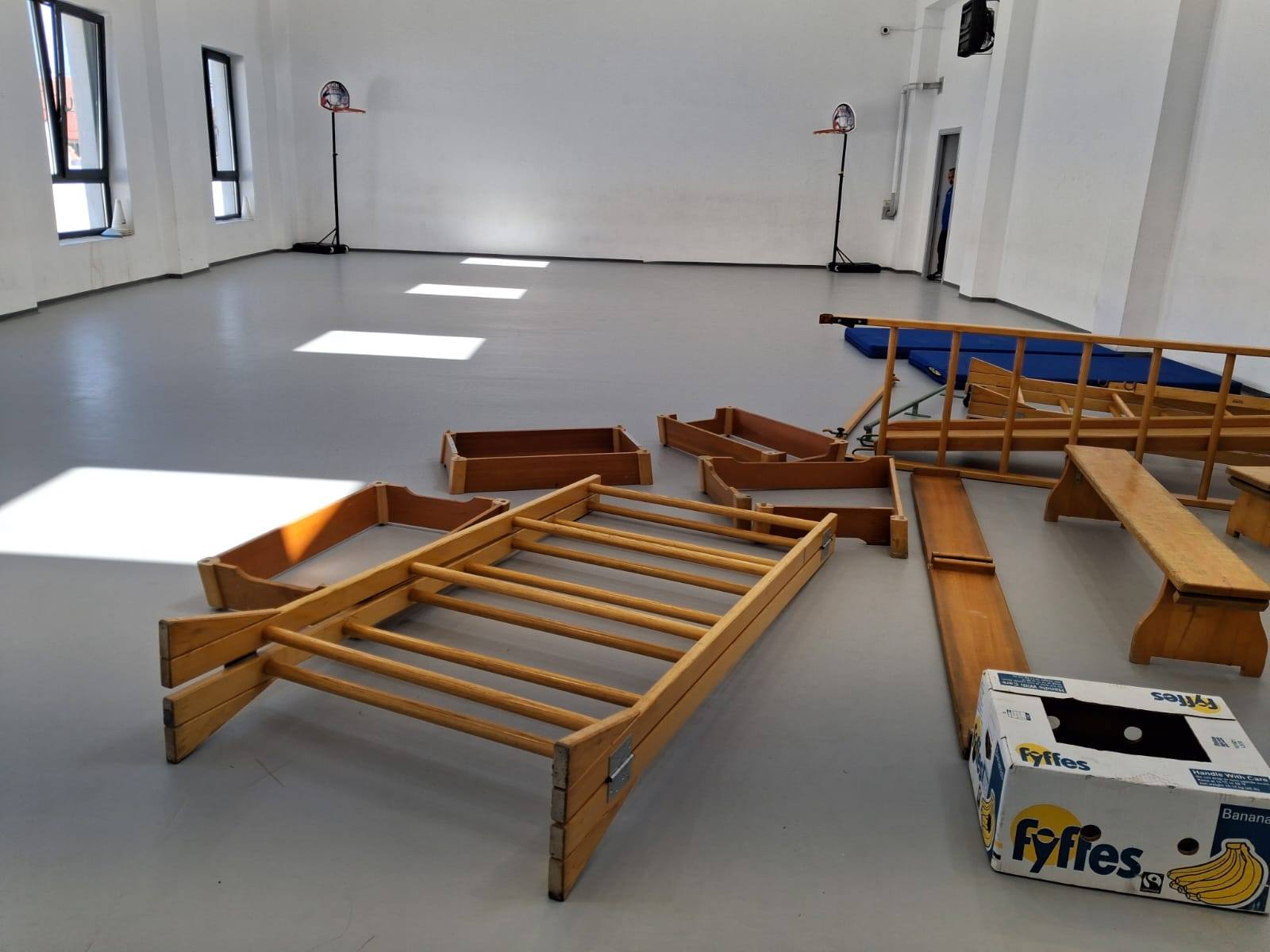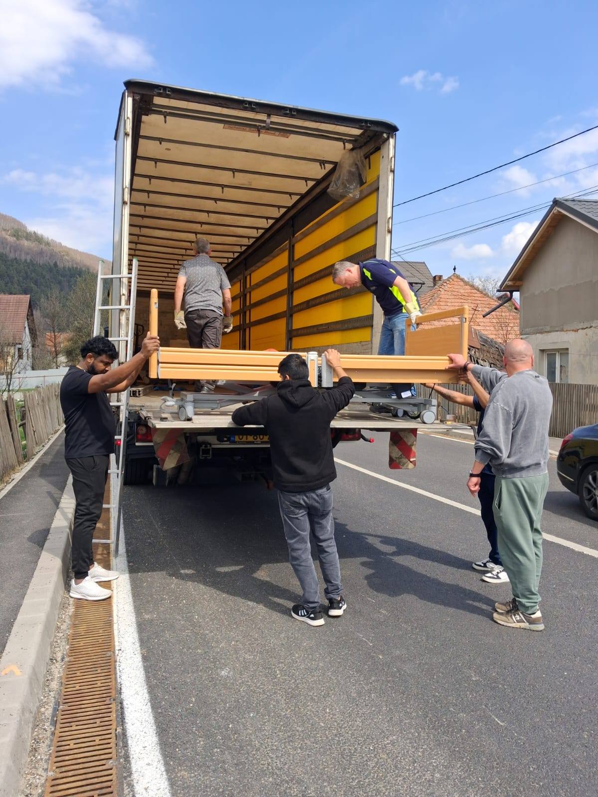 Om 11:30 was, op een aantal grote items na, de trailer leeg. 😁👌Gera heeft ervoor gezorgd dat een deel van het materiaal dezelfde dag al werd opgehaald, waardoor het snel op de plaats van bestemming aankwam. Voordat de vrijwilligers vertrokken hebben ze nog geholpen een paar hoog-laag bedden van elkaar af te tillen. Deze hebben we klaargezet in de trailer, zodat ze snel op locatie gelost konden worden. Samen met Gera reden we eerst naar een basisschool in Codlea. Hier hebben we diverse gymtoestellen gebracht. Een aantal school kinderen hebben ons geholpen met het lossen. Deze gymtoestellen hadden wij gedoneerd gekregen van SCO-t.
